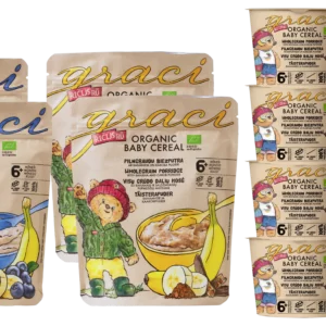 A combination of 2 different organic wholegrain porridge recipes in easy to use pouches and one portion cups. The recipes are organic, 100% natural, without added sugar or milk designed for babies from 6 months of age.